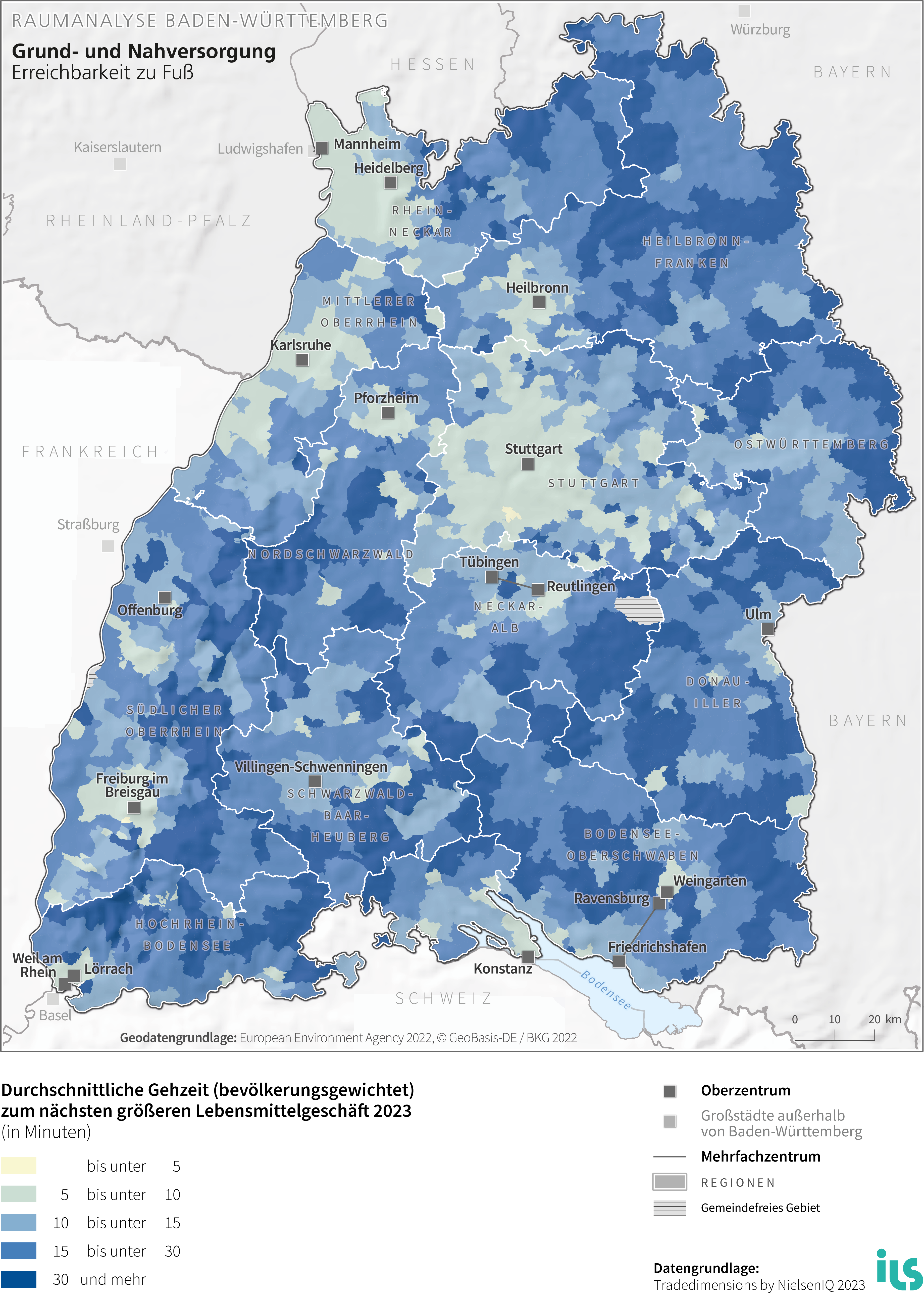 In Baden-Württemberg gibt es aktuell nach den Daten von Tradedimensions by NIQ rund 3.400 Lebensmittelgeschäfte mit einer Verkaufsfläche ab 400 Quadratmetern. Zwischen 2013 und 2023 stieg ihre Zahl um rund 5 % an. Unter den größeren Lebensmittelgeschäften entwickelte sich lediglich die Zahl der SB-Warenhäuser mit 5.000 und mehr Quadratmetern Verkaufsfläche in diesem Zeitraum rückläufig (-5 %).